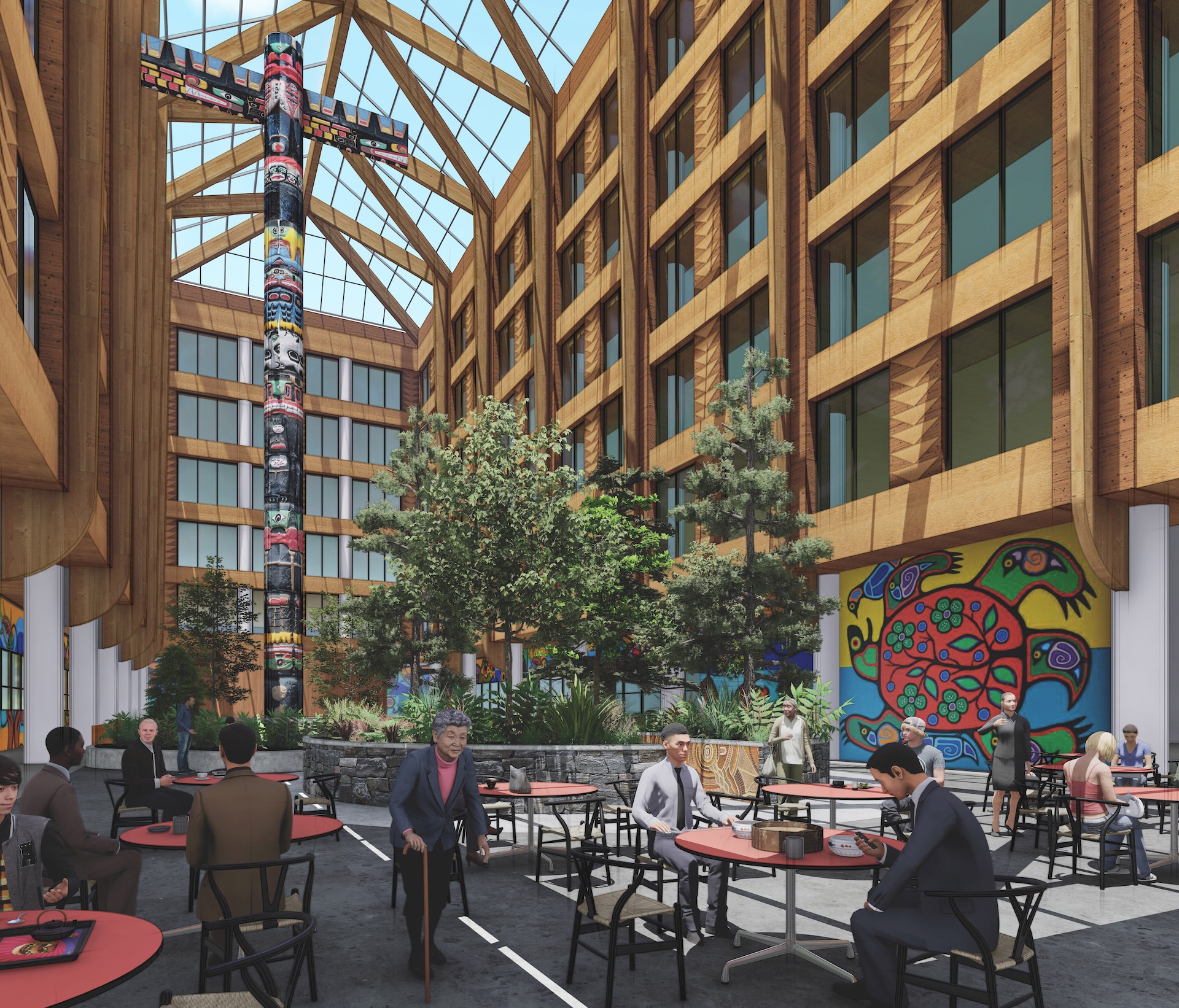 The design for the 655,000-square-foot building, led by Number TEN Architectural Group, includes approximately 370 affordable residential units, each offering either an exterior view or overlooking a spacious atrium lit with skylights and featuring artwork and designs by First Nations communities. The blueprints also include SCO offices, a daycare and restaurants on the main floor, as well as commercial office and retail spaces for lease that will prioritize First Nations businesses and entrepreneurs.